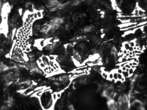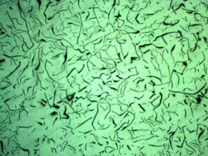 When we look at cast iron under a microscope, we see interesting patterns. The main things we see are: