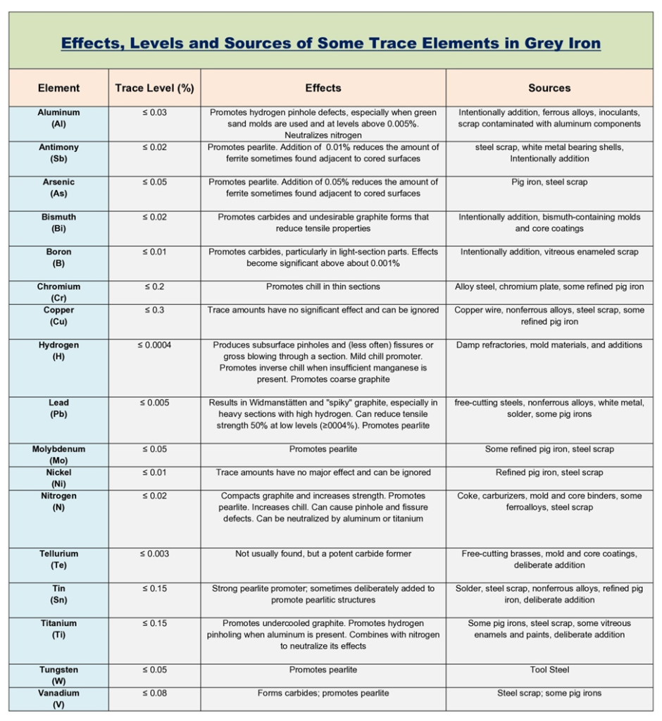 • In addition to the primary elements, several trace elements also affect the properties of gray iron. Below Table, based on data from the British Cast Iron Research Association (BCIRA), outlines the effects of these trace elements and their possible sources. Many of these elements can be added intentionally, depending on the required properties. For example, tin and copper are often added to promote the formation of pearlite in gray iron.
